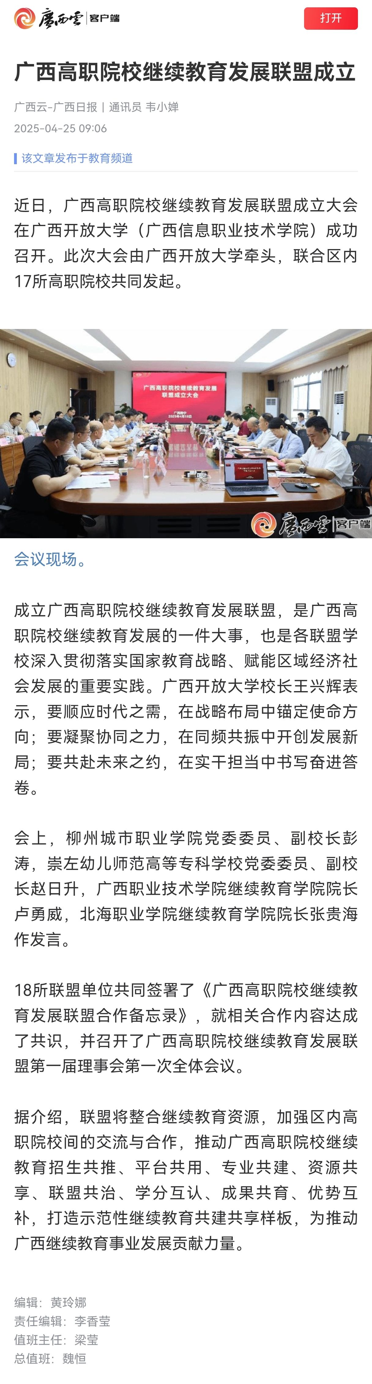 4月25日,广西云-广西日报以“广西高职院校继续教育发展联盟成立大会召开”为题,报道了广西高职院校继续教育发展联盟成立大会在我校召开的相关情况。现将报道转载如下。