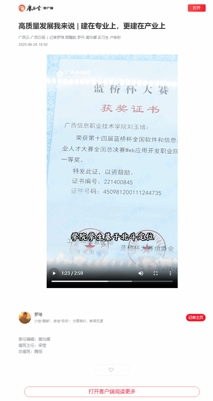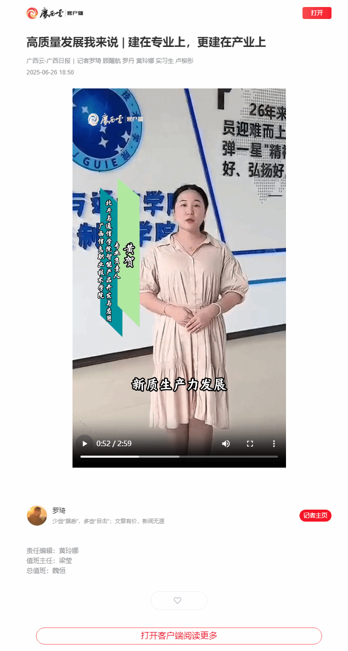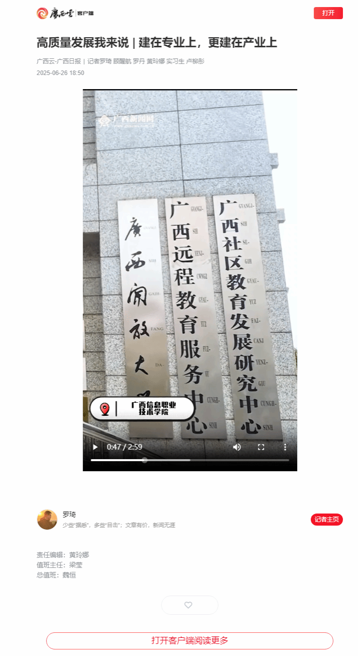 6月26日,广西云-广西日报以《建在专业上,更建在产业上》为题,报道广西信息职业技术学院以北斗应用产业链需求为导向,整合集成电路技术智能产品开发与应用、互联网应用技术、社会地理信息技术等专业,围绕北斗导航、自主龙芯、开源鸿蒙等新质生产力,打造“北斗+”专业群。同时,学院积极与龙芯中科、紫光、华为以及北斗领军企业和科研院所合作,构建“产学研创用”五位一体的人才培养模式等相关情况。现将报道转载如下。