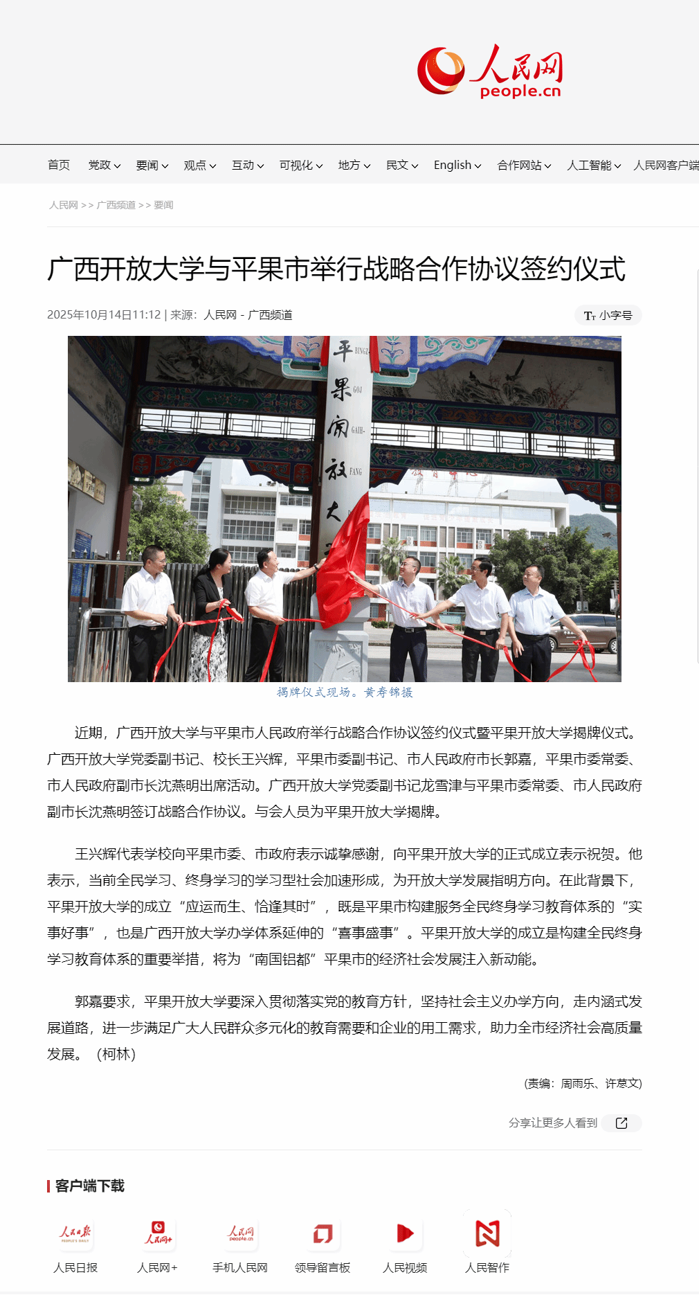 10月14日,人民网-广西频道以“广西开放大学与平果市举行战略合作协议签约仪式”为题,报道了广西开放大学与平果市人民政府举行战略合作协议签约仪式暨平果开放大学揭牌仪式的相关情况。现将报道转载如下。