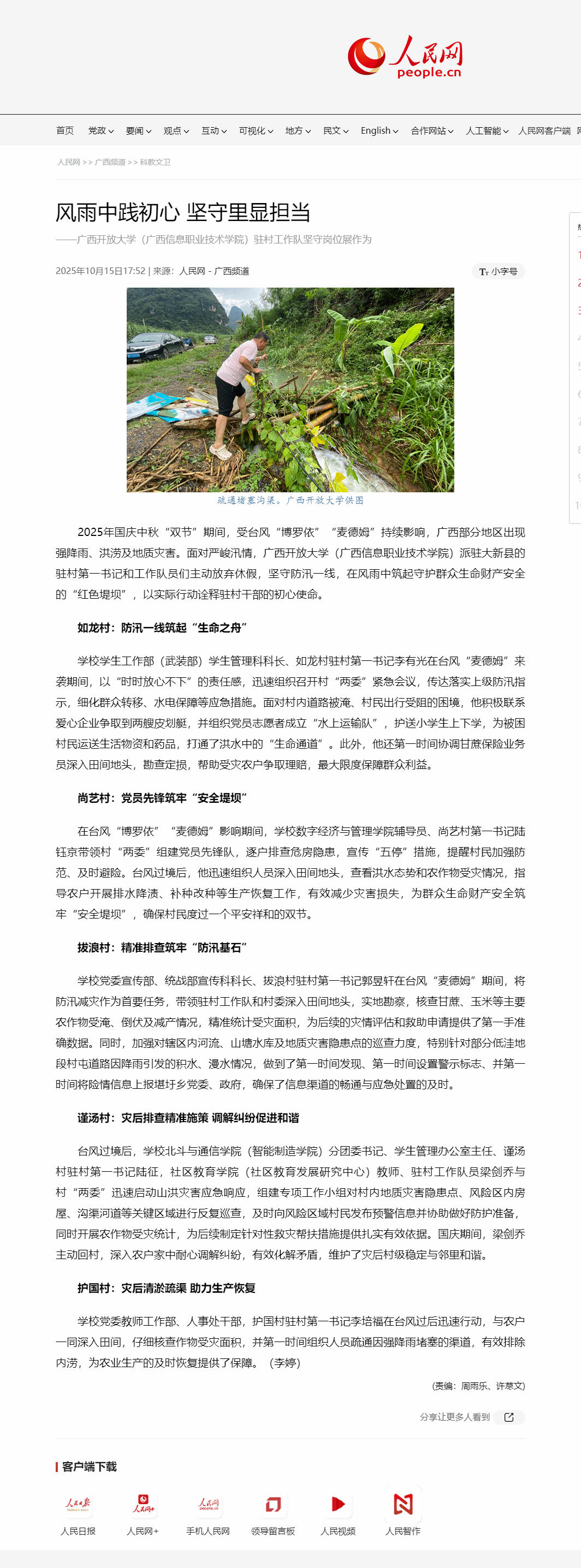 10月15日,人民网-广西频道以“风雨中践初心 坚守里显担当——广西开放大学(广西信息职业技术学院)驻村工作队坚守岗位展作为”为题,报道了面对2025年国庆中秋“双节”期间,台风“博罗依”“麦德姆”造成强降雨、洪涝及地质灾害等严峻汛情,广西开放大学(广西信息职业技术学院)派驻大新县的驻村第一书记和工作队员们主动放弃休假,坚守防汛一线,在风雨中筑起守护群众生命财产安全的“红色堤坝”,以实际行动诠释驻村干部初心使命的相关情况。现将报道转载如下。