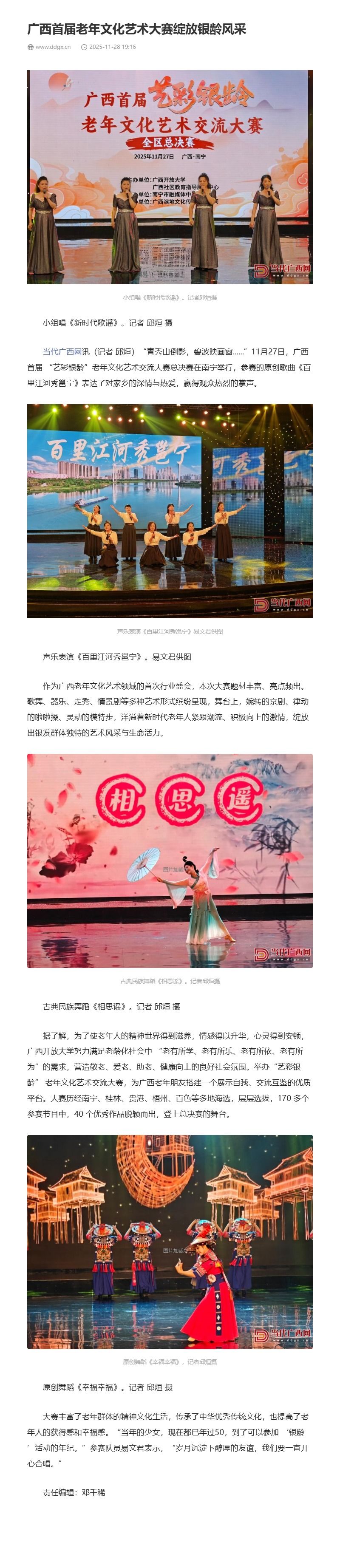 11月28日,当代广西网以“广西首届老年文化艺术大赛绽放银龄风采”为题,报道了为了使老年人的精神世界得到滋养,情感得以升华,心灵得到安顿,广西开放大学努力满足老龄化社会中 “老有所学、老有所乐、老有所依、老有所为”的需求,营造敬老、爱老、助老、健康向上的良好社会氛围。举办“艺彩银龄” 老年文化艺术交流大赛,为广西老年朋友搭建一个展示自我、交流互鉴的优质平台。大赛历经南宁、桂林、贵港、梧州、百色等多地海选,层层选拔,170 多个参赛节目中,40 个优秀作品脱颖而出,登上总决赛舞台的相关情况。现将报道转载如下。