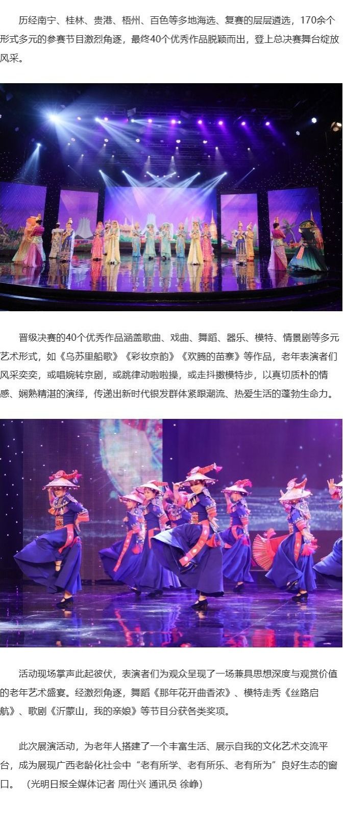 11月28日,光明日报客户端以“广西首届老年文化艺术交流大赛在南宁举行”为题,报道了11月27日,由广西开放大学、广西社区教育指导服务中心联合主办的广西首届“艺彩银龄”老年文化艺术交流大赛总决赛在南宁市融媒体中心演播厅举行。历经南宁、桂林、贵港、梧州、百色等多地海选、复赛的层层遴选,170余个形式多元的参赛节目激烈角逐,最终40个优秀作品脱颖而出,登上总决赛舞台绽放风采的相关情况。现将报道转载如下。