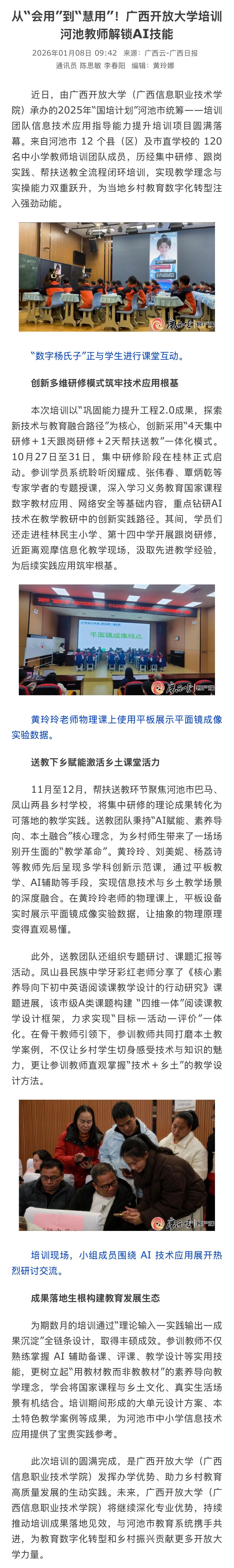 1月8日,广西新闻网以“从‘会用’到‘慧用’!广西开放大学培训河池教师解锁AI技能”为题,报道了由广西开放大学(广西信息职业技术学院)承办的2025年“国培计划”河池市统筹——培训团队信息技术应用指导能力提升培训项目圆满落幕。来自河池市 12 个县(区)及市直学校的 120 名中小学教师培训团队成员,历经集中研修、跟岗实践、帮扶送教全流程闭环培训,实现教学理念与实操能力双重跃升,为当地乡村教育数字化转型注入强劲动能的相关情况。现将报道转载如下。