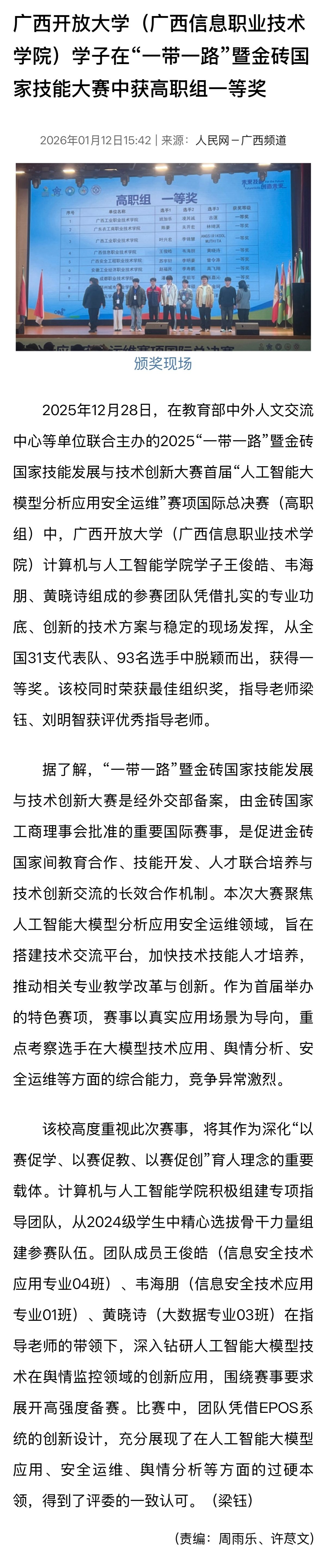 1月12日,人民网-广西频道以“广西开放大学(广西信息职业技术学院)学子在‘一带一路’暨金砖国家技能大赛中获高职组一等奖”为题,报道了在教育部中外人文交流中心等单位联合主办的2025“一带一路”暨金砖国家技能发展与技术创新大赛首届“人工智能大模型分析应用安全运维”赛项国际总决赛(高职组)中,广西开放大学(广西信息职业技术学院)计算机与人工智能学院学子王俊皓、韦海朋、黄晓诗组成的参赛团队,从全国31支代表队、93名选手中脱颖而出,获得一等奖。学校同时荣获最佳组织奖,指导老师梁钰、刘明智获评优秀指导老师的相关情况。现将报道转载如下。