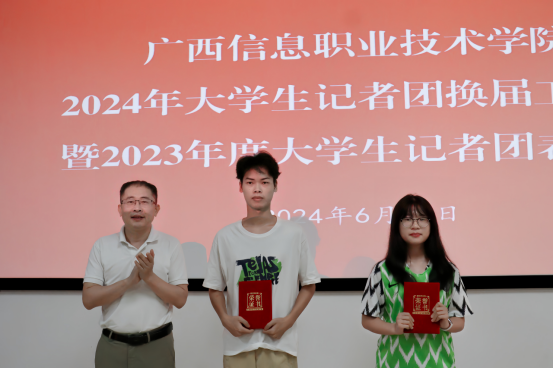 党委宣传部 杨红 大学生记者团 覃锦凤 报道 6月14日,我校大学生记者团首届换届大会成功召开。会议为获得2023年度大学生记者团“突出贡献奖”“优秀通讯员”等奖项的同学颁奖,宣布了拟任新一届大学生记者团学生干部的名单。校长助理陈广杰应邀参加会议。