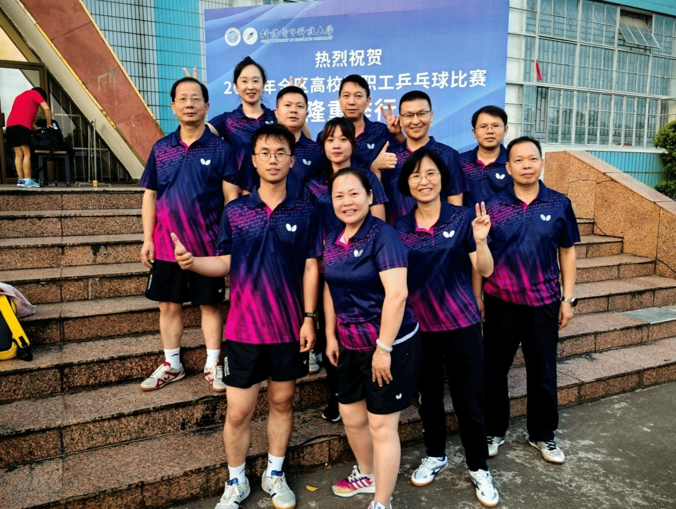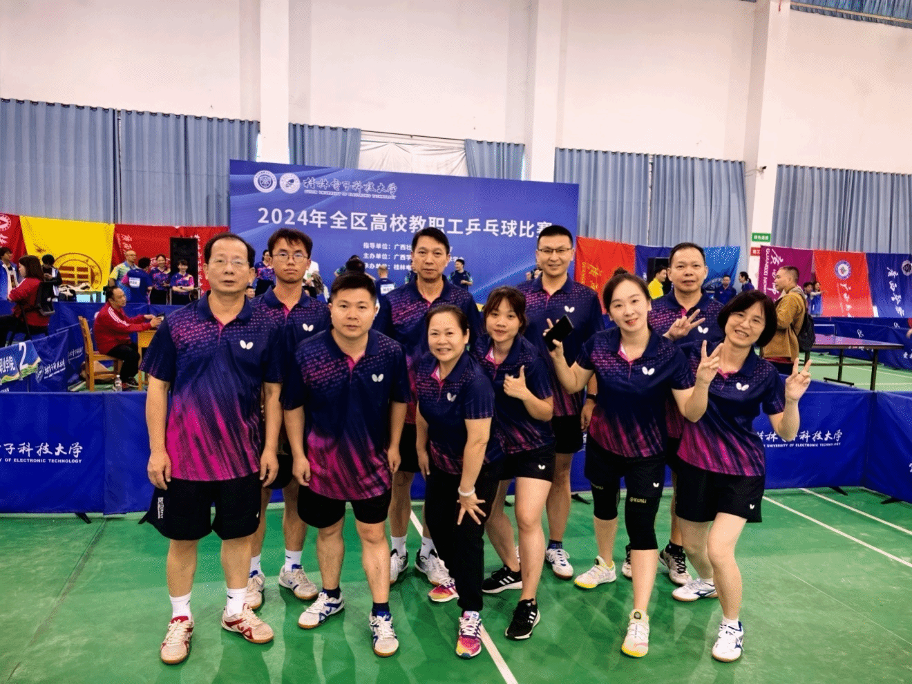 校工会 吴易轩报道 11月4日至7日,由广西壮族自治区教育厅指导,广西学校体育卫生艺术学会主办,桂林电子科技大学承办的2024年全区高校教职工乒乓球赛在桂林电子科技大学金鸡岭校区体育馆隆重举行,我校共选派了12名运动员参赛。