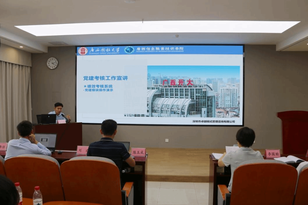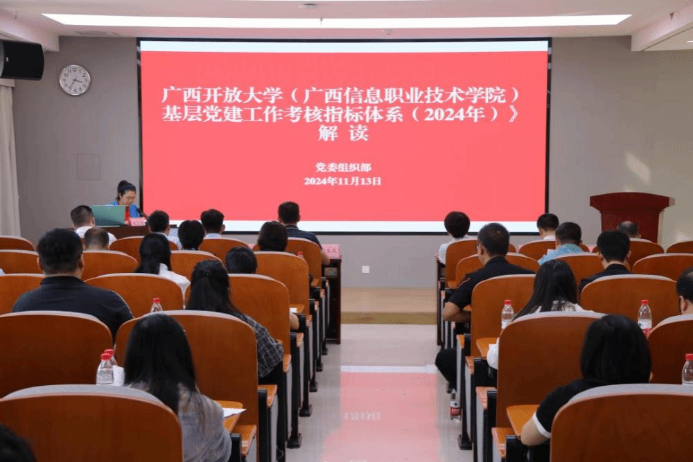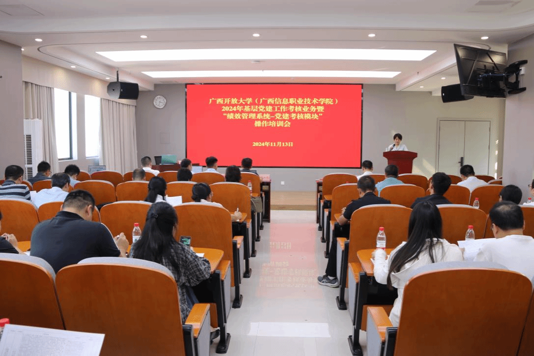 党委组织部 关振华报道 为进一步提升基层党建工作信息化水平,扎实开展学校2024年基层党建工作考核,11月13日下午,我校在东宝校区远教大厦16楼会议室举办2024年基层党建工作考核业务暨“绩效管理系统-党建考核模块”操作培训会。学校党委委员、组织部部长、广西信息职业技术学院党委副书记陈雪松,广西信息职业技术学院副院长李国助、陈广杰,各党总支、党支部书记,专职组织员以及其他支委等60余人参加培训。培训由陈雪松主持。
