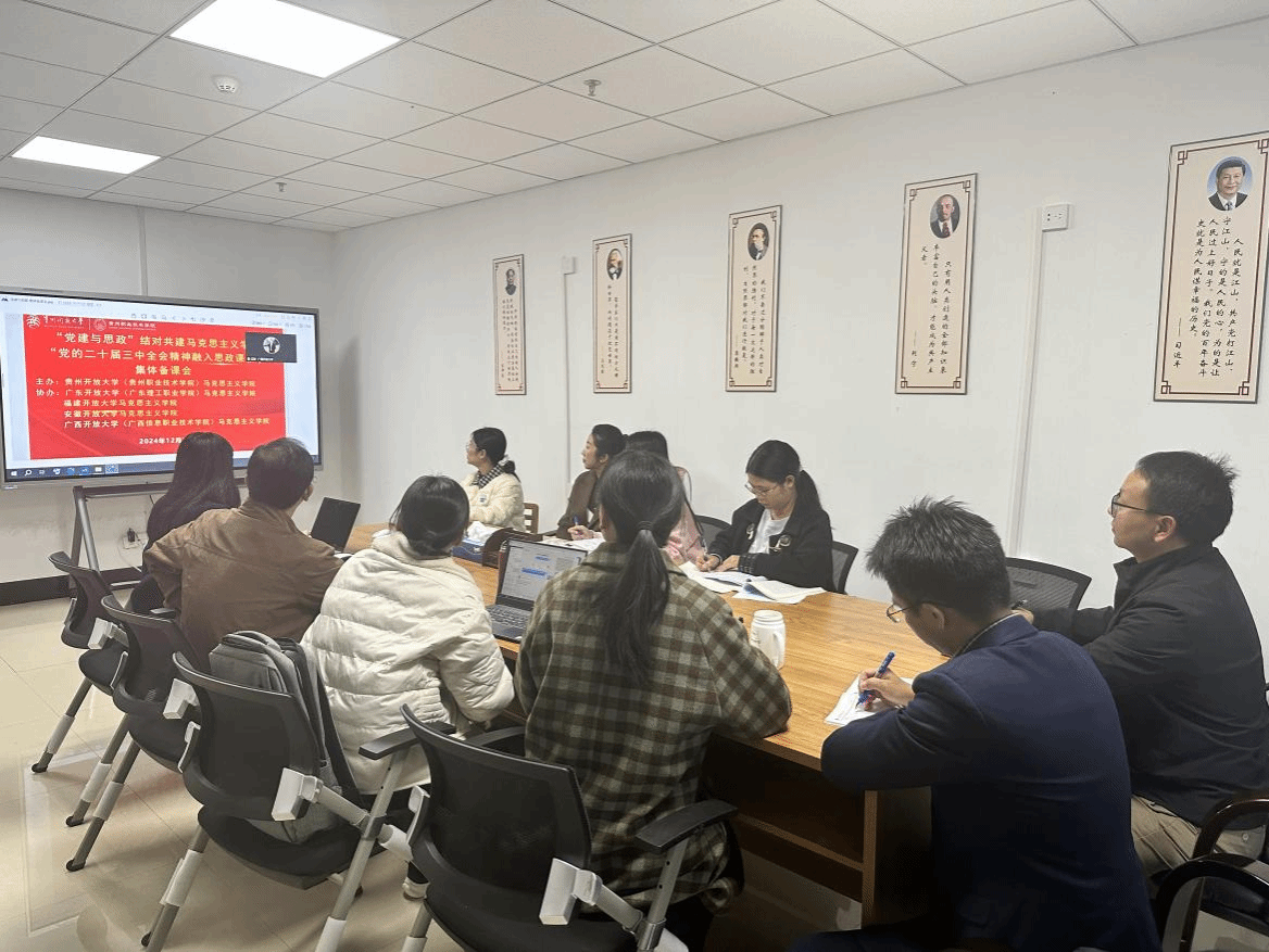 马克思主义学院 林新绣报道 12月10日,为深入学习贯彻党的二十届三中全会精神,加强思政课教学交流与合作,我校马克思主义学院在行政楼508会议室通过线上方式参加了由贵州开放大学(贵州职业技术学院)马克思主义学院主办的“党建与思政”结对共建集体备课活动。
