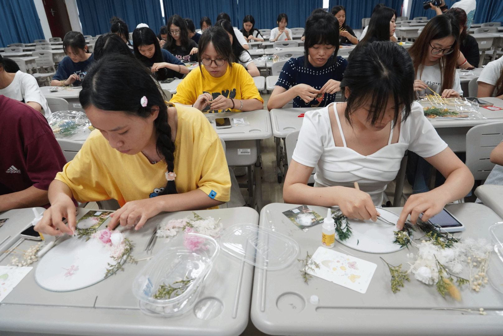 在手工制作环节,指导老师带领同学们制作艾草香包、永生花干团扇、创意竹编风铃挂件等特色工艺品,鼓励同学们要坚守匠心、大胆尝试。同学们轻挑慢缝,剪裁粘贴,精益求精享受手作的乐趣,获得轻松快乐的体验。