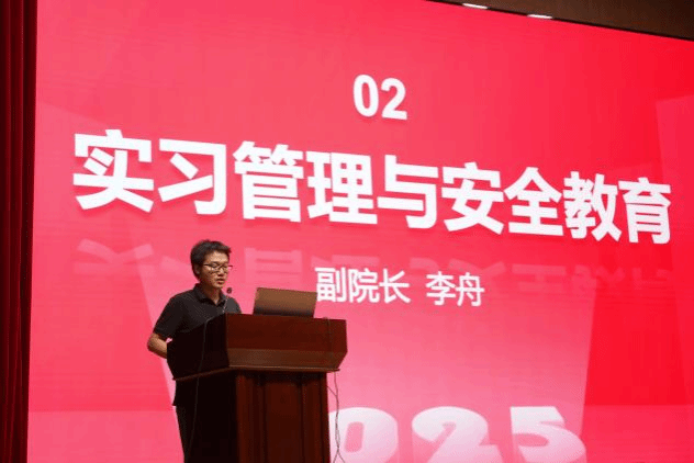学院副院长李舟针对实习日常管理提出具体要求,包括考勤制度、日报周报月报、实习总结、就业材料等材料的提交规范,并重点强调了实习期间安全注意事项,提醒同学们要树立安全意识,筑牢安全防线。