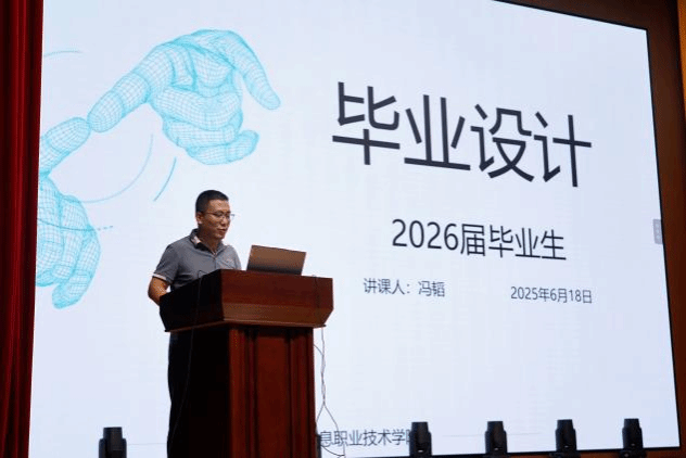 学院副院长冯韬围绕毕业设计进行专项安排,从选题、开题、指导记录到答辩及成绩评定等作了详细讲解,帮助同学们明晰毕业设计的流程与标准,为后续毕业认定做好准备。