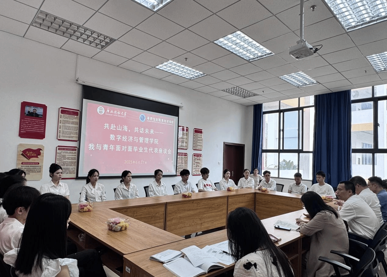 数字经济与管理学院 欧淑玲 报道 6月27日,数字经济与管理学院召开2025届毕业生座谈会。广西信息职业技术学院副院长,数字经济与管理学院党总支书记、院长李国助向毕业生寄予殷切期望,学院班子、班主任、辅导员与毕业生代表齐聚一堂,共叙校园情谊,共话未来发展。