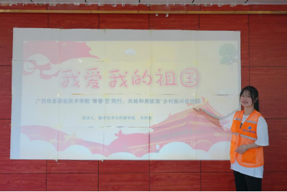 数字艺术与传媒学院 覃锦凤 孟宗慧 徐明姣 报道 为深化爱国主义教育,助力乡村文化振兴,7月10日,数字艺术与传媒学院乡村振兴促进团紧扣边境民族地区特色,在大新县拔浪村精心组织了一场以“我爱我的祖国”为主题,以维护民族团结及边境安全的爱国主义教育为内容系列宣讲活动,激发了孩子们作为“边境小卫士”的自豪感与责任感。