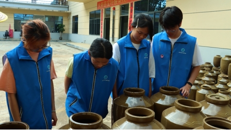 穿过菜园,发酵车间里百余口陶缸整齐排列,坛沿的酸水泛着细密气泡。“传统老坛发酵每坛要精准控制温度和盐分。”宝西村支书介绍着传统工艺的讲究,学生们认真记录,这些都是产品独特性的体现,也是直播时吸引消费者的重要内容。