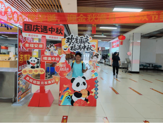 活动现场吸引了同学们踊跃参与。在美食区,水果、月饼及传统小吃等各色菜品琳琅满目,还有食堂师傅们精心研发的“创新菜系”,同学们排起长队,争相品尝美食。在互动体验区,大家参与抽奖赢餐券,手动制作棉花糖,参加活动的同学们心情愉悦,现场非常热闹。