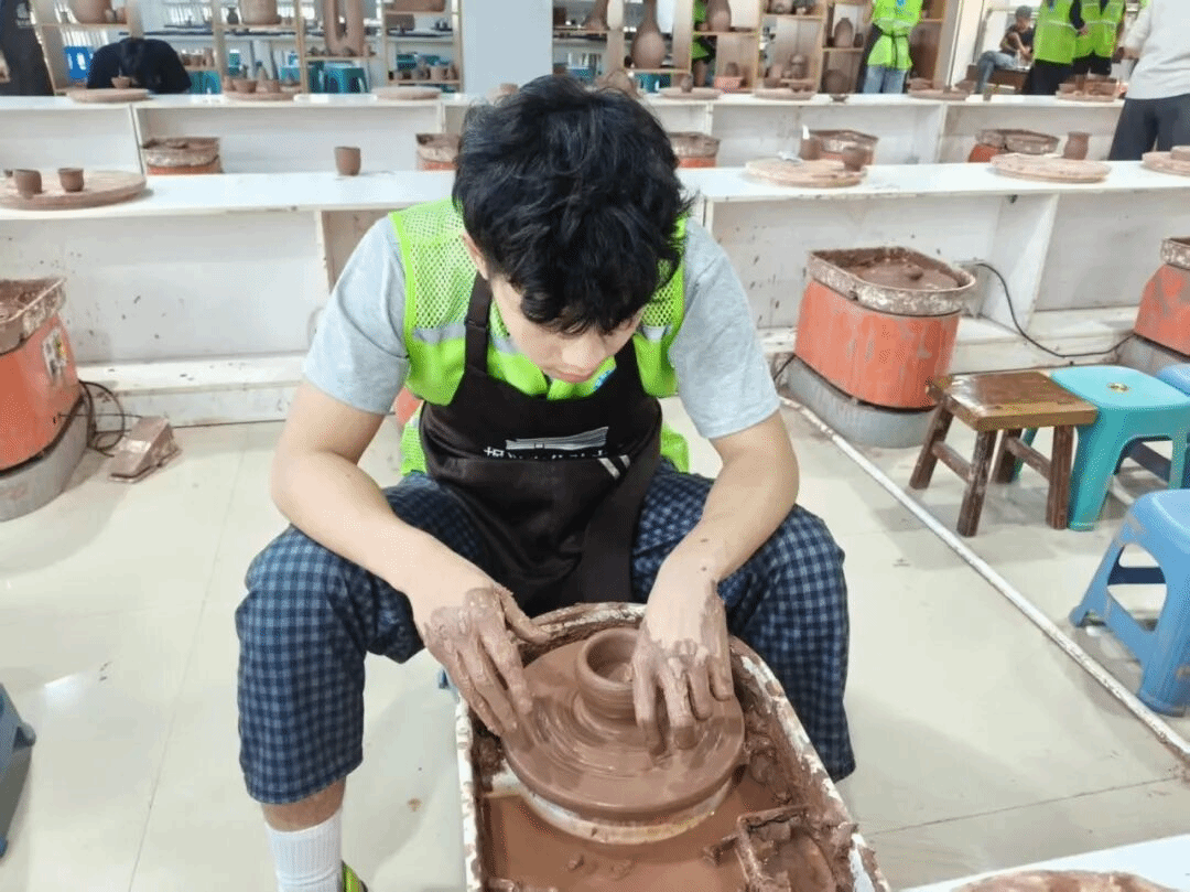 在坭兴陶艺师的指导下,同学们从揉泥拉坯到雕刻烧制,完整体验了坭兴陶制作全过程。最终完成的三十余件作品,涵盖茶具、摆件等品类,既保留了传统纹样韵味,又融入了独特的青春创意,展现了同学们对传统工艺的传承与创新。