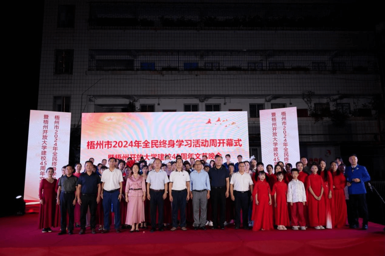 梧州开放大学 李雯报道10月18日晚,梧州开放大学举行了梧州市2024年全民终身学习活动周开幕式暨建校45周年文艺晚会。广西开放大学副校长黄鹄,梧州市委老干部局二级巡视员杨安,中共梧州市委教育工委书记、市教育局党组书记、局长覃映霞,梧州开放大学党总支书记、校长聂振传,部分兄弟院校、地市开放大学领导等出席晚会。各合作办学单位、全体教职工、学员代表以及步埠社区群众参加晚会。