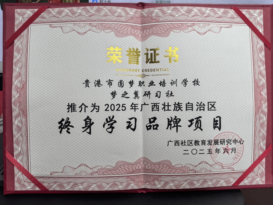 贵港开放大学 梁惠进 报道 近日,广西社区教育发展研究中心公布了2025年广西“终身学习品牌项目”宣传推介名单,由贵港开放大学推荐的贵港市圆梦职业培训学校“梦之翼研习社”成功入选。