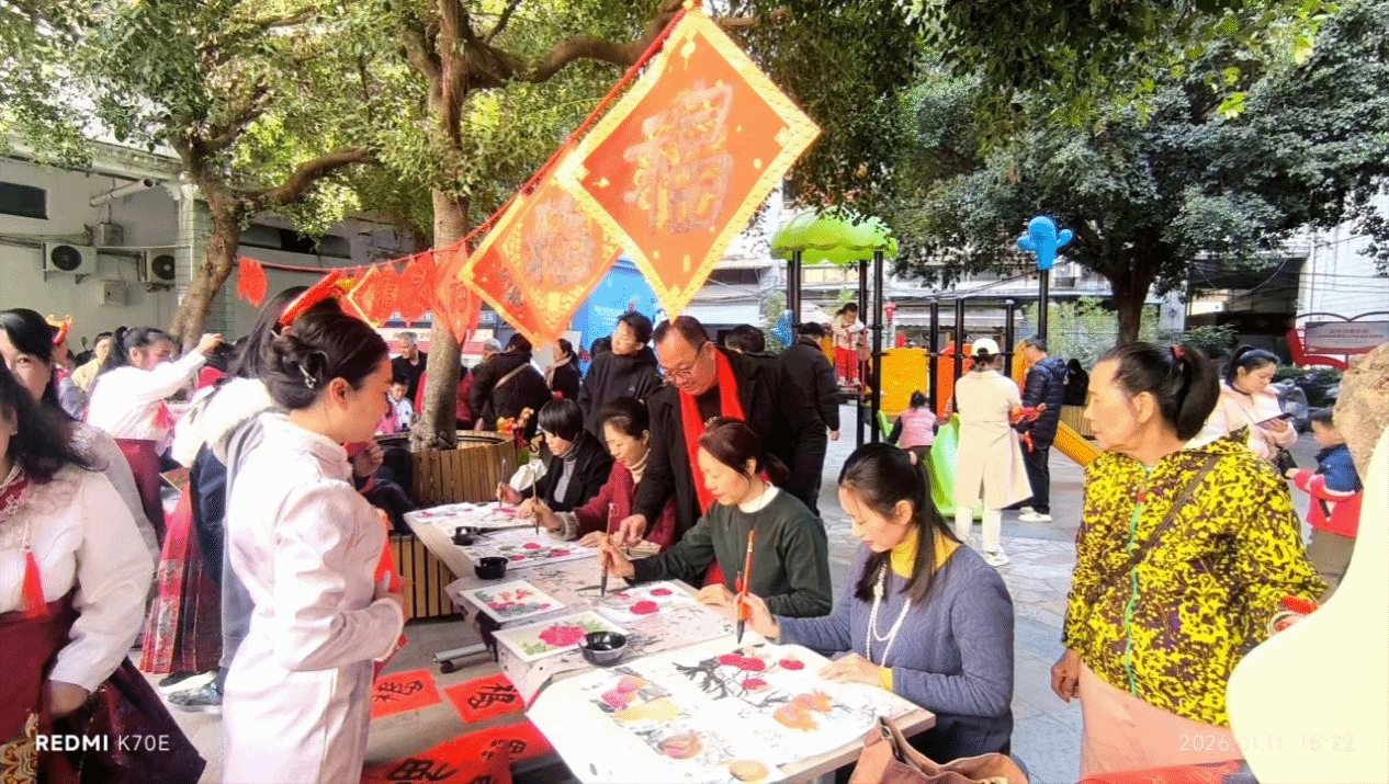 书法班师生挥毫泼墨,红纸铺展间,楷书、行书、隶书等各式“福”字与春联新鲜出炉。手写的墨香与真挚的祈愿,让传统年俗在互动中焕发新生。