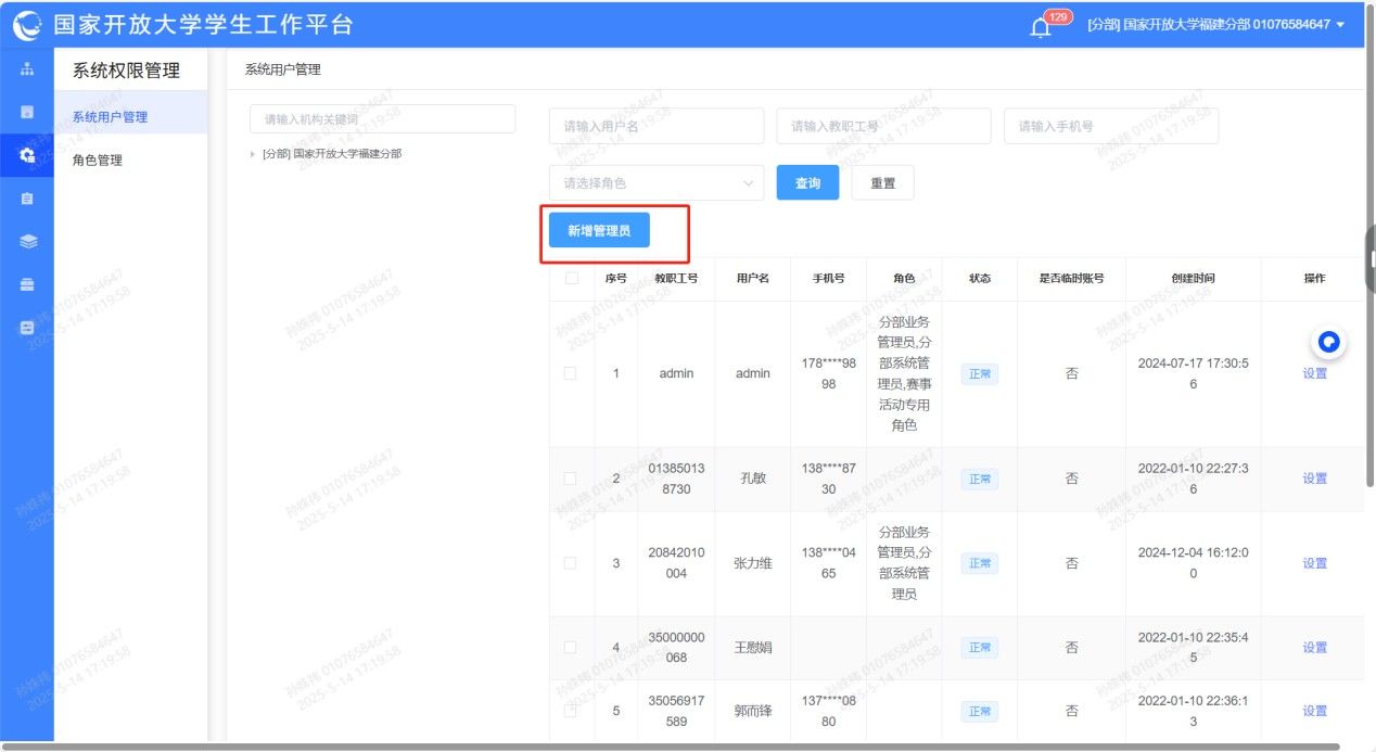 (一)进入【系统用户管理】,点击【新增管理员】权限。