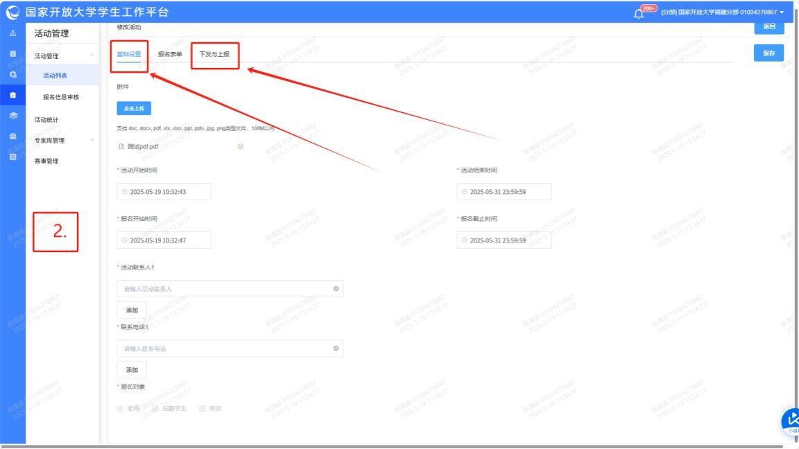 所有层级需通过系统用户管理为下一层级设定活动大赛管理员权限,教师工号可通过建立QQ群等方式获取。严格遵循“总部→分部(学院)→分校→学习中心”的活动下发流程,以及“学习中心→学院→分校(学院)→总部”的作品上报流程,确保各环节按活动时间截点完成操作。