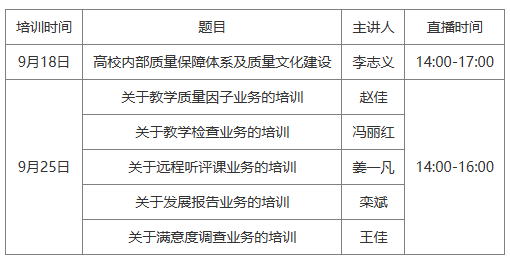 我国高校内部质量保障和质量文化建设,以及体系质量监控与评估业务,研修视频可回放。具体安排如下: