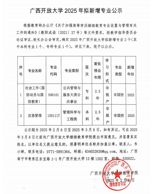 广西开放大学2025年拟新增专业公示