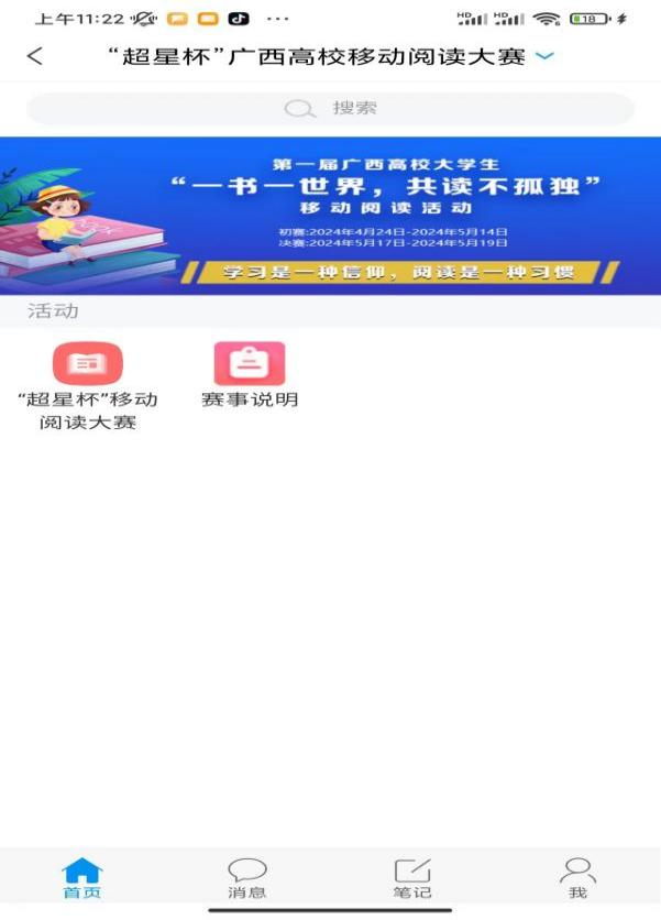 3.首页右上角点击输入邀请码“gxcxds”进入“超星杯”广西高校移动阅读大赛首页。