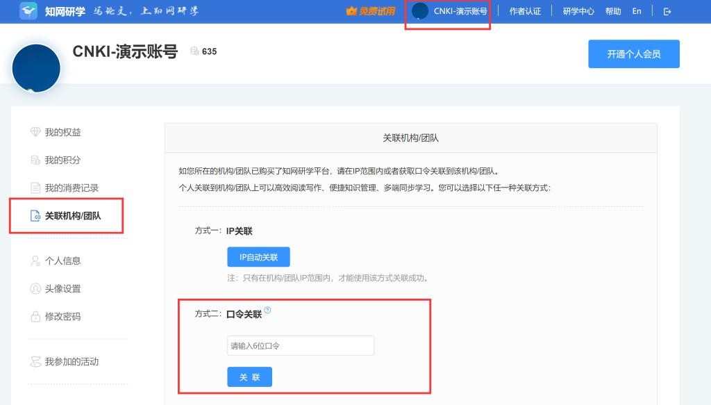 3、登录个人账号后,在研学平台“个人中心”,选择“关联机构团队”,在关联处输入(口令:BC4PND),关联成功后出现学校名称即可正常使用。(如下图片所示)
