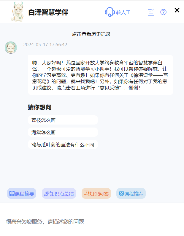 目前,智慧学伴“白泽”已上线国家终身教育智慧教育平台并覆盖平台全部课程,提供了课程摘要、知识点总结、知识问答、课程知识推荐等适应终身学习场景的AI助学功能,未来还将实现智能客服答疑等功能,并部署至更多课程。
