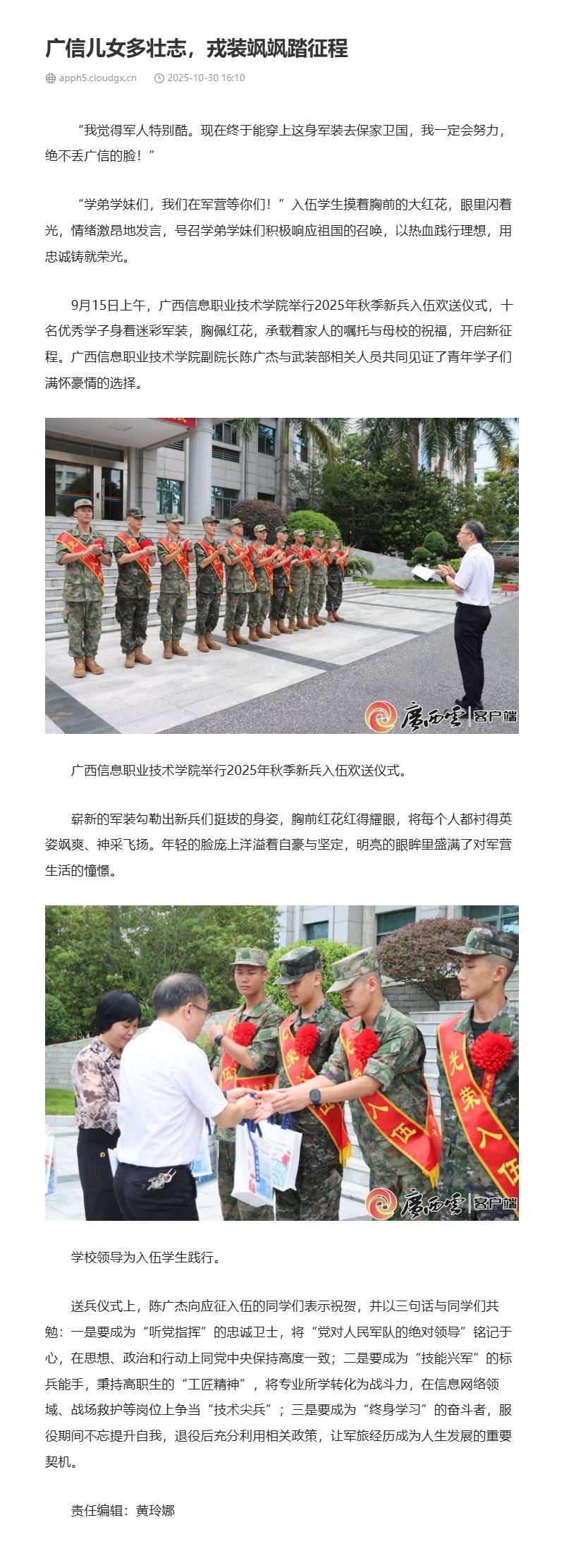 10月30日,广西云-广西日报以“广信儿女多壮志,戎装飒飒踏征程”为题,报道了广西信息职业技术学院举行2025年秋季新兵入伍欢送仪式,十名优秀学子身着迷彩军装,胸佩红花,承载着家人的嘱托与母校的祝福,开启新征程。广西信息职业技术学院副院长陈广杰与武装部相关人员共同见证了青年学子们满怀豪情入伍的相关情况。现将报道转载如下。