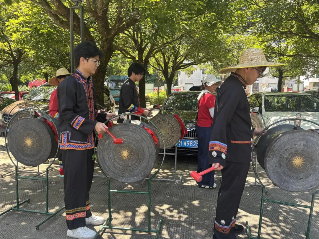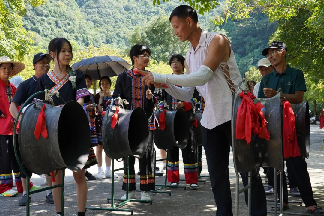 随后,实践团成员换上民族服装,在铜鼓浑厚的回响里,民间艺人手把手指点:鼓面轻重、鼓点疏密、腰肢俯仰,一招一式皆藏千年密码。鼓槌起落间,铜纹在掌心发烫,鼓魂在血脉奔涌。