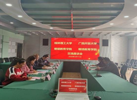 继续教育学院韦小婵报道 为深化校际合作,推进专本衔接教育高质量发展,2026年3月11日上午,桂林理工大学继续教育学院一行到我校交流座谈,我校继续教育学院院长梁大海,副院长黎富贵及相关人员参会。
