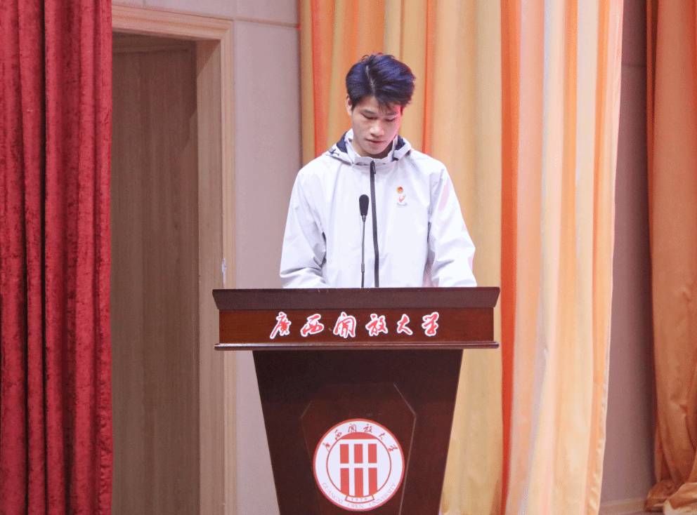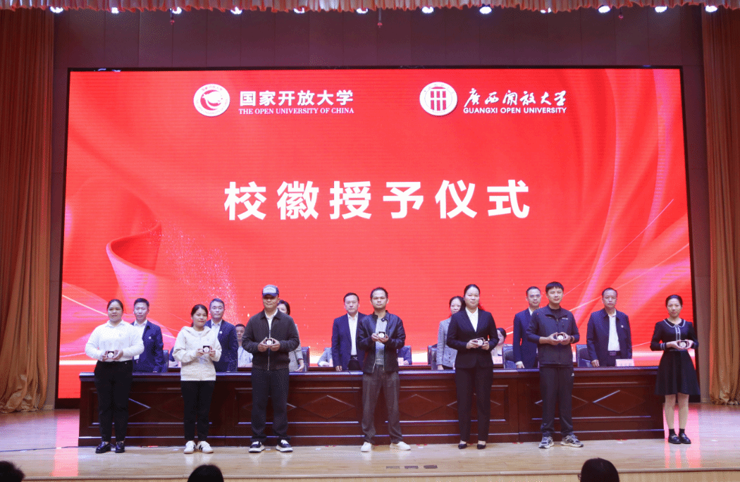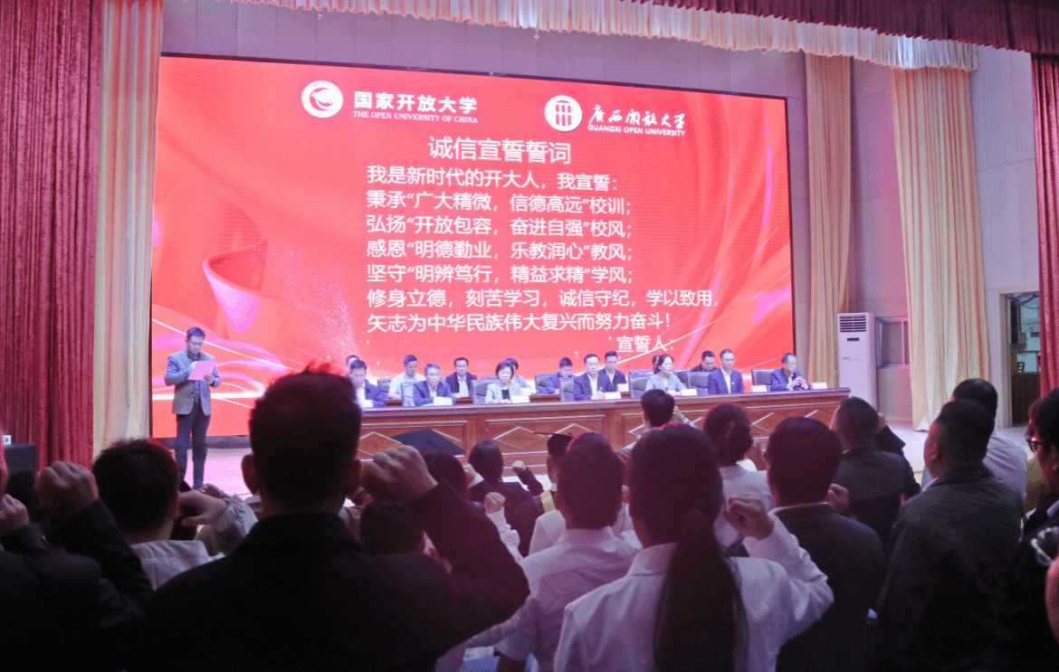 典礼上,学校领导为新生代表佩戴校徽。新生代表黄亮量带领全体同学进行诚信宣誓。教师代表兰利丹、新生代表潘卓、老生代表韦纳斯分别发言,分享心得与展望。全体师生齐声合唱广西开放大学校歌《身边的大学》,并合影留念,现场气氛庄重而热烈。