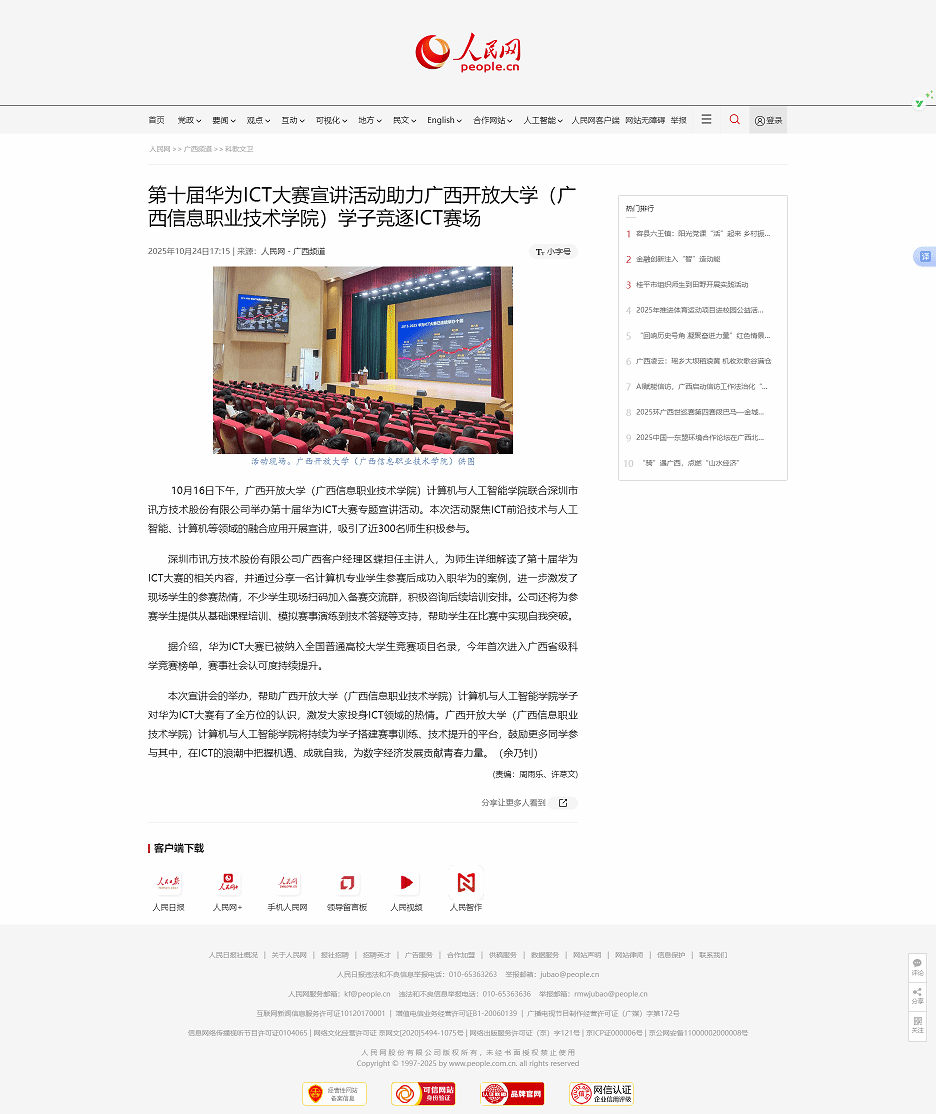 10月24日,人民网-广西频道以“第十届华为ICT大赛宣讲活动助力广西开放大学(广西信息职业技术学院)学子竞逐ICT赛场”为题,报道了广西开放大学(广西信息职业技术学院)计算机与人工智能学院联合深圳市讯方技术股份有限公司举办第十届华为ICT大赛专题宣讲活动的相关情况。现将报道转载如下。