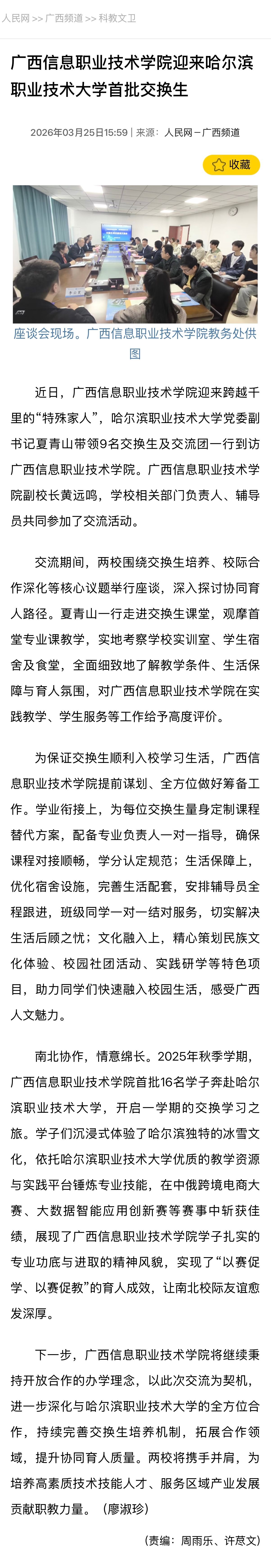 3月25日,人民网-广西频道以“广西信息职业技术学院迎来哈尔滨职业技术大学首批交换生”为题,报道了广西信息职业技术学院迎来哈尔滨职业技术大学9名交换生及交流团一行到访,两校围绕交换生培养、校际合作深化等核心议题举行座谈,深入探讨协同育人路径的相关情况。现将报道转载如下。