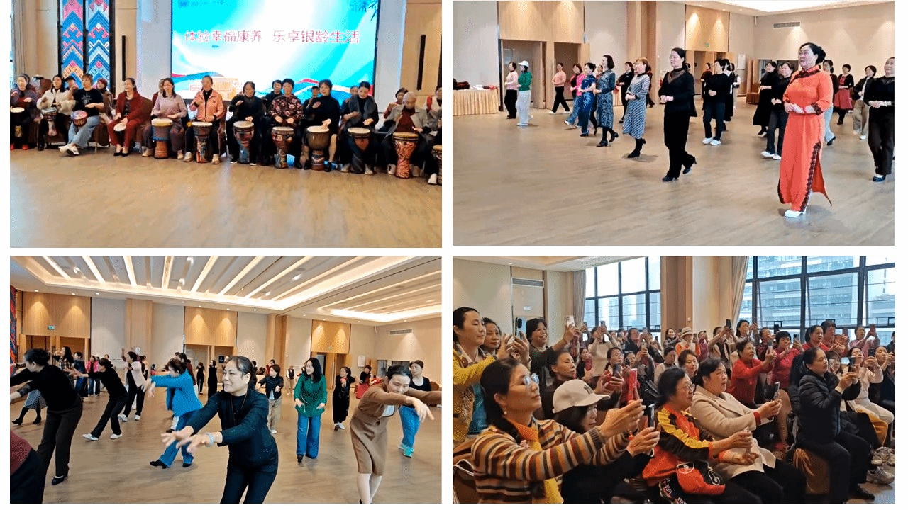 各教学点结合自身优势,精心设计贴合老年学员需求的特色课程。课程兼顾实用性与趣味性,让学员在沉浸式体验中学习技能、收获快乐。在手机摄影公益课上,课堂内座无虚席,社区居民早早到场、热情参与,带着对智能科技的好奇与对摄影技巧的渴望,沉浸式开启科技学习之旅。在舞蹈公益课上,专业老师伴着舒缓的音乐,逐一分解决动作要领,学员们跟着节奏舒展身姿。在非洲鼓公益课上,学员们跟着老师的节奏整齐敲击,脸上洋溢着欢快的笑容。在旗袍走秀公益课上,学员们在老师的指导下练习站姿、走姿,举手投足间尽显端庄韵味。在形体公益课上,学员们跟着老师的指令,缓缓伸展手臂、活动腰腹,动作柔和而有力。